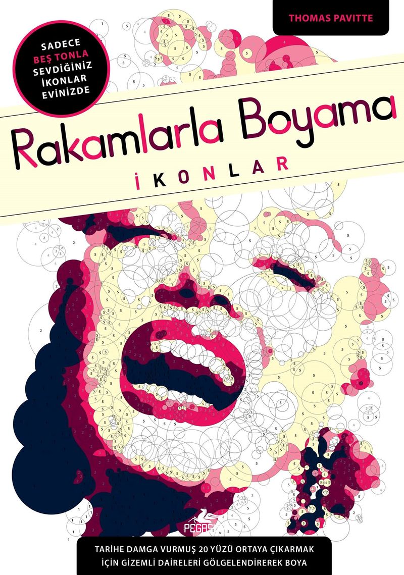AUDREY HEPBURN, CHE GUEVARA, MARILYN MONROE, AMY WINEHOUSE, ELVIS PRESLEY, KURT COBAIN, PRENSES DIANA, JAMES DEAN gibi 20 ünlünün portresine yer veren Rakamlarla Boyama: İkonlar sanatçı ruha sahip her yaştan insana renklendirmeyle geçirilecek eğlenceli saatler vadediyor. Eserinin kendine özgü olması için renklerini belirle, portrenin kime ait olduğunu ortaya çıkar ve tamamladığın portreyi kitaptan kolayca koparıp sergile.