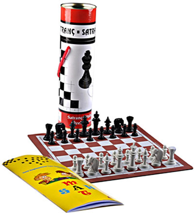 Plastik satranç taşları, kaymaz zemin ve kitabı ile birlikte Silindir kutu içerisinde satılmaktadır.