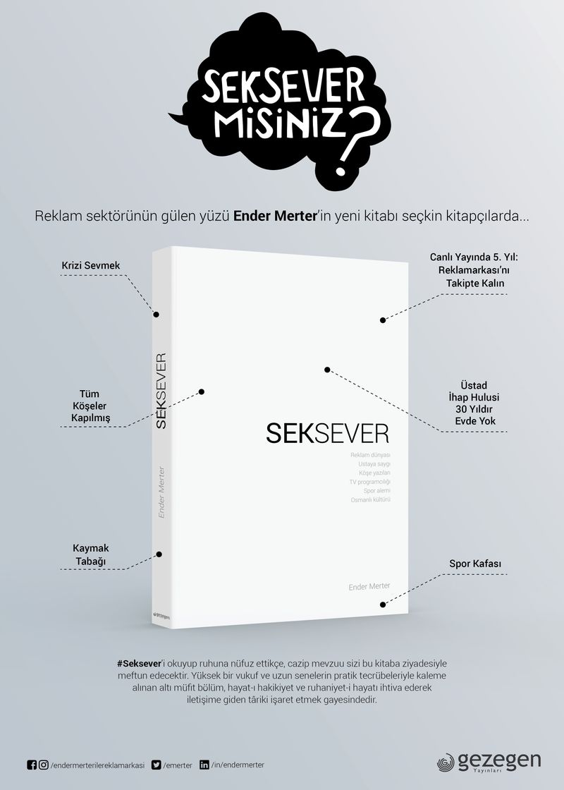 Renkli kişiliği ile nasıl gönüllere taht kurup her daim herkeste bir parça tat bırakıyorsa Merter, altı bölümden oluşan SEKSEVER de okurlarının illaki sevecek bir şeyler bulmasını sağlıyor. Çok yönlü olabilmenin getirisi olsa gerek; iletişimin bu koşuda başı çektiği, grafik sanatının, siyasetin, reklamın, sporun ve erotizmin peşi sıra gittiği ve harmanlandığı bir kitap çıkarıyor ortaya.