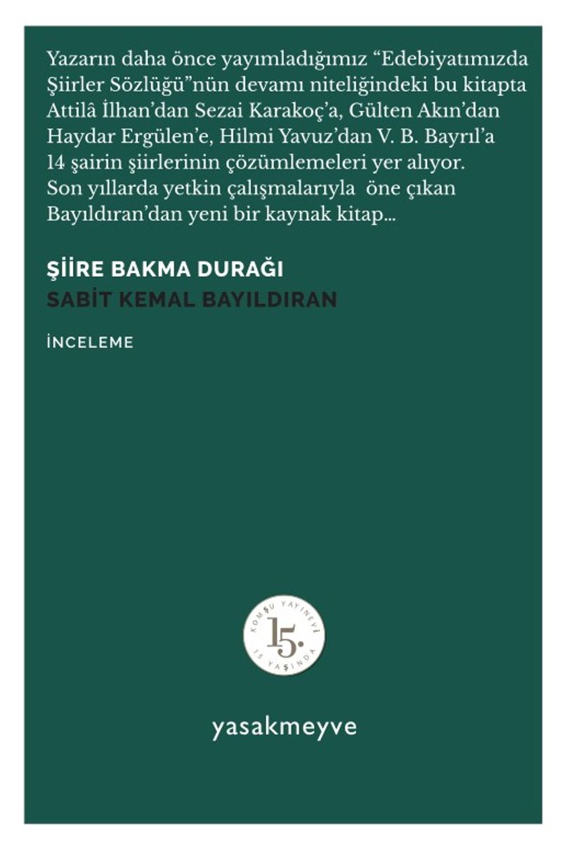 Yazarın daha önce yayımladığımız “Edebiyatımızda Şiirler Sözlüğü”nün devamı niteliğindeki bu kitapta Attilâ İlhan’dan Sezai Karakoç’a, Gülten Akın’dan Haydar Ergülen’e, Hilmi Yavuz’da V. B. Bayrıl’a 14 şairin şiirlerinin çözümlemeleri yer alıyor. Son yıllarda yetkin çalışmalarıyla  öne çıkan Bayıldıran’dan yeni bir kaynak kitap…