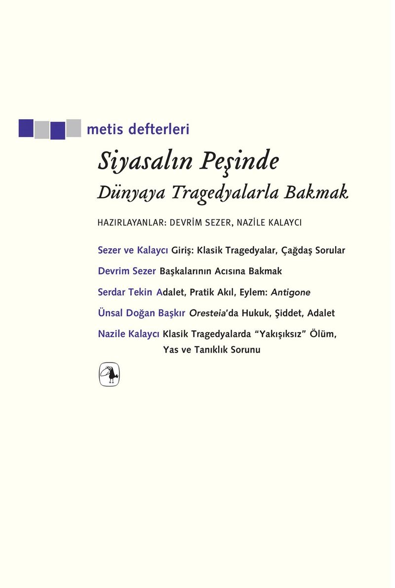 Klasik tragedyalar siyaset felsefesi ve psikanalizde sık sık yorum konusu olmuştur. Bu zengin metinlerden bazıları (Persler, Troyalı Kadınlar, Antigone, Oresteia, Eumenidler ve Yakarıcılar) burada ilk defa telif yazılarda, düşünce tarihiyle diyalog içinde ele alınıyor. Kitap kronolojik olarak uzak görünen ama içerdiği olaylarla gayet yakın duran bir geçmişe ait bu metinlerle çiftyönlü bir ilişki kurma amacını güdüyor: Bir yandan siyaset felsefesindeki tartışmaları ve günümüz problemlerini klasik tragedyaların ışığında irdelemek istiyor, bir yandan da “çağdaş tartışmalardan hareketle tragedyaları yeniden yorumlamak.