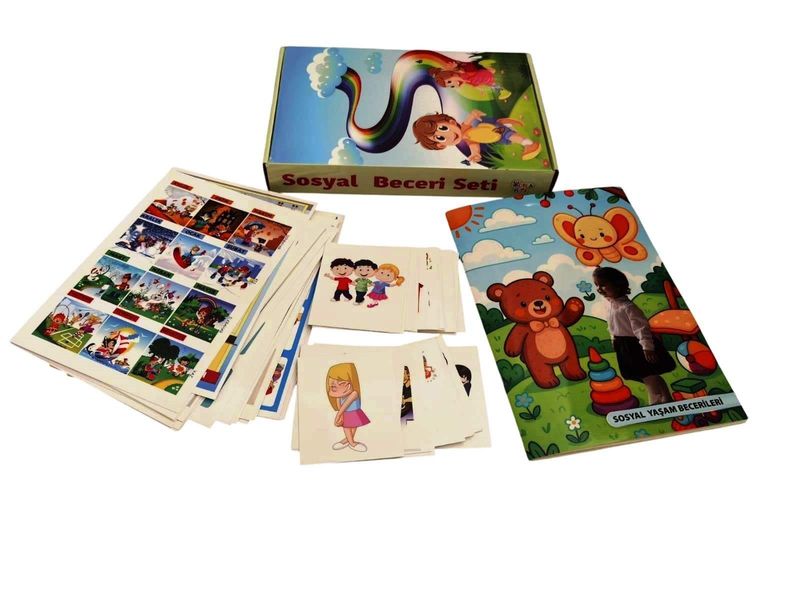 2. Büyük kartlar: 25 adet büyük karttan oluşur ve sosyal ilişkilere dair bilgiler içerir. (Kartların arkasında resimlere ilişkin bilgi ve sorular içerir.)