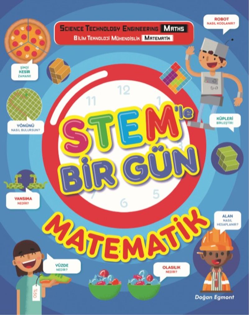 STEM ile eğlenerek öğrenmeye hazır mısın? STEM kısaltması, Science (Bilim), Technology (Teknoloji), Engineering (Mühendislik) ve Mathematics (Matematik) sözcüklerinin baş harflerinden oluşur. STEM günlük yaşamının her anında karşına çıkar. STEM konularından biri olan matematik, sayıları ve şekilleri araştırır. Pizza nasıl eşit parçalara bölünür? Bir salyangozun hızını nasıl ölçersin? Eğer nereye bakacağını bilirsen matematiği her yerde görebilirsin. Bu kitap, sabah uyandığın andan itibaren akşam yatana kadar geçirdiğin süre boyunca etrafında görebileceğin matematik konularını anlatıyor. Evde yapılabilecek kolay deneyler! Eğlenceli bulmacalar! Bilimle ilgili merak ettiğin soruların cevaplarını bu kitapta bulacaksın. İyi eğlenceler!