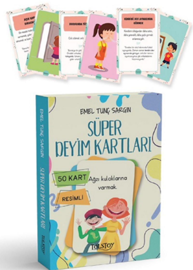 Bu deyim kartları ile deyimleri tanıma ve anlamını öğrenme fırsatı yakalayacaksınız. 50 deyimin yer aldığı kartlarımızın ön yüzünde deyimlerin eğlenceli çizimlerini görecek, arka yüzünde ise deyimlerin anlamlarını içeren tümceler bulacaksınız. Bu kartları kullanarak arkadaşlarınızla oyunlar oynayabilir ve bu kartları derslerinizde yardımcı kaynak olarak da kullanabilirsiniz.