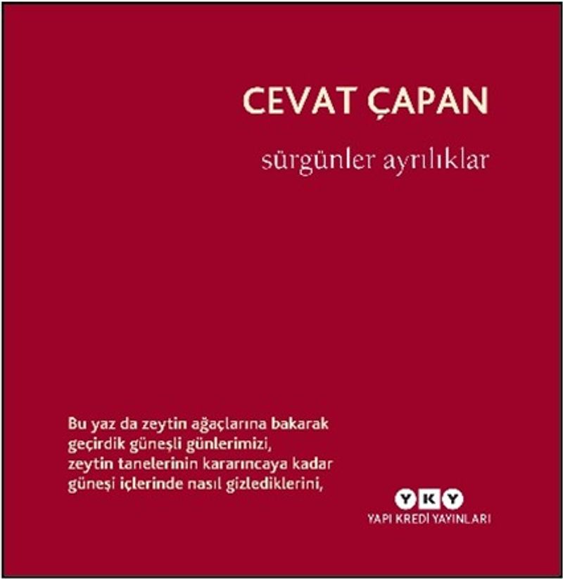 Cevat Çapan’ın yeni şiir kitabı Sürgünler Ayrılıklar yayımlandı. Şairin Bana Düşlerini Anlat adlı toplu şiirler kitabıyla öbür kitapları da Yapı Kredi Yayınları tarafından yayımlanmakta. Son şiirlerinin yer aldığı Sürgünler Ayrılıklar içindeki “Yarım Kalmış Bir Şiir Antolojisi”nde Çapan, şiirimizdeki çağdaşlarını dize dize resmediyor.