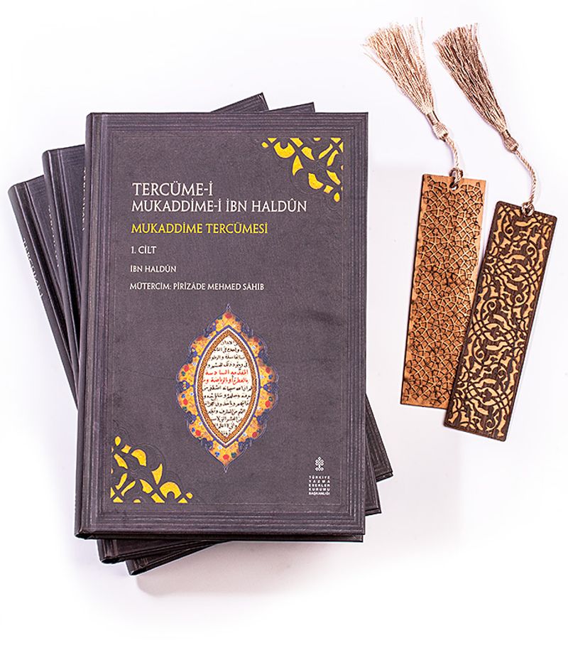 Tercüme-i Mukaddime-İ İbn Haldun (3 Cilt) + Ahşap Ayraç - Osmanlı Desen + Ahşap Ayraç - Lale - Rölyef Cevizli