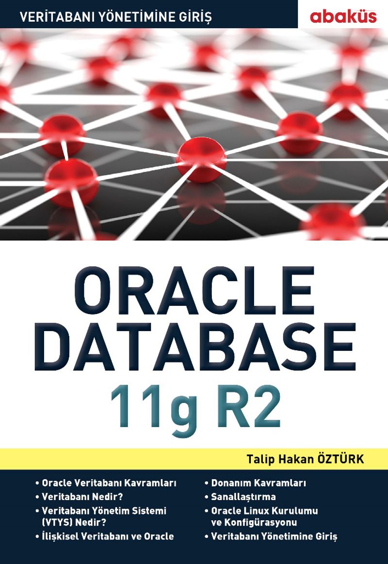 Oracle Database Hakkında Temel Başvuru Kaynağı ORACLE Veritabanı ile çalışacak olanlar için ORACLE Veritabanı öğrenim kılavuzu olacak şekilde tasarlanan kitap 2 ciltten oluşuyor. Birinci cilt, veritabanı temel kavramlar, sunucu donanım kavramları, kurulum, konfigürasyon ve veritabanı yönetimine giriş konularını kapsıyor. İkinci cilt ise veritabanı yönetimini detaylı bir şekilde kapsıyor. Kitabın ikinci cildi 2015 yılı içerisinde Abaküs Kitap tarafından yayınlanacak. Kitapta ORACLE veritabanının Windows üzerinde kurulumunun yanı sıra Linux üzerinde de kurulumu, konfigürasyonu ve yönetimini ekran görüntüleriyle olabildiğince sade bir biçimde anlatılıyor. Öğrenmenin en güzel yöntemi uygulayarak öğrenmektir düşüncesinden yola çıkılarak özellikle ekran görüntülerine ve uygulamalara önem verilen bir anlatım tarzı öne çıkartılıyor. Oracle Veritabanı Kavramları Veritabanı Nedir? Veritabanı Yönetim Sistemi (VTYS) Nedir? İlişkisel Veritabanı ve Oracle Oracle Veritabanı Yöneticisi (DBA) Kimdir? Ne İş Yapar? SQL ve PL/SQL Kavramları SQL*Plus ve SQL Developer Veritabanı Araçları Oracle Veritabanı Mimarisi Donanım Kavramları Sanallaştırma Oracle Linux Kurulumu ve Konfigürasyonu RDBMS Yazılım Kurulumu Veritabanının Oluşturulması Veritabanı Yönetimine Giriş