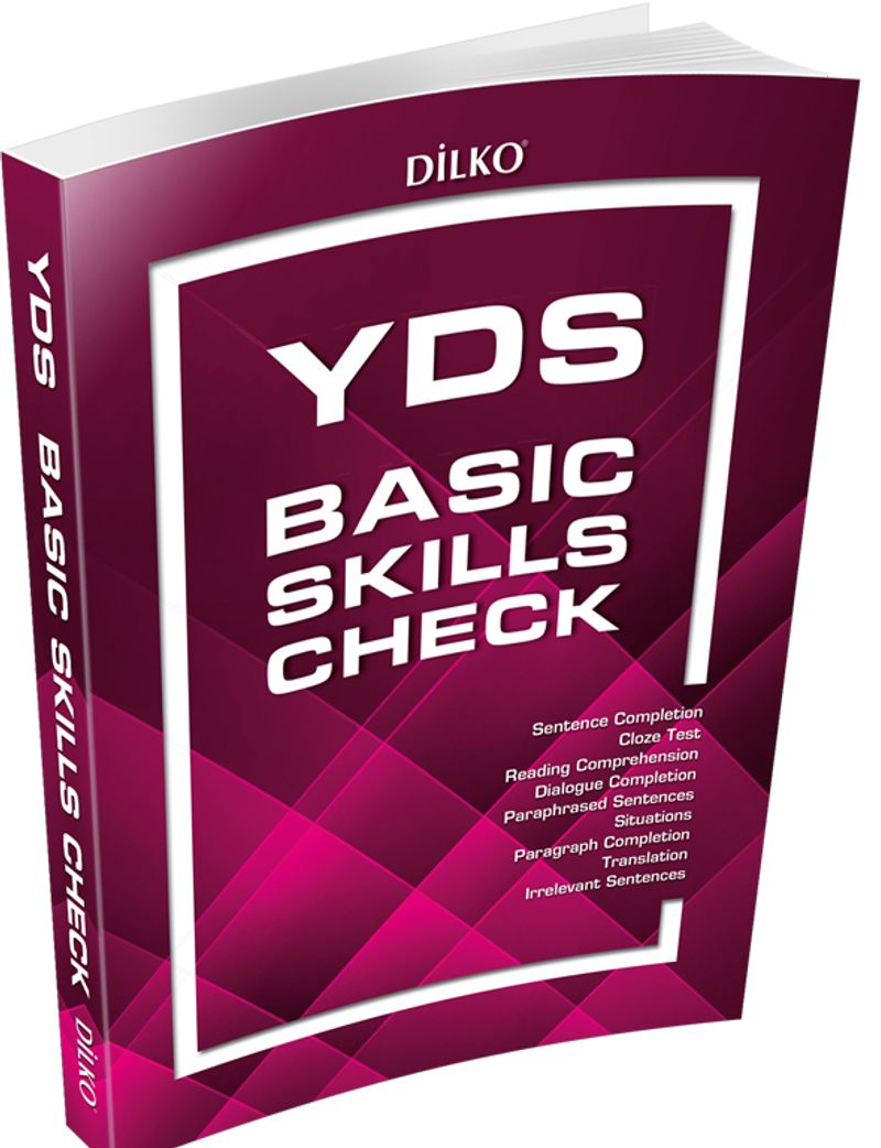 YDS BASIC SKILLS CHECK kitabı, tüm soru tiplerini tarayan, Yabancı Dil sınavına hazırlanan öğrenciler için oluşturulmuş bir soru bankasıdır ve 300 sayfadan oluşmaktadır. ÖSYM’nin YDS İngilizce seviyesine kıyasla biraz daha kolay sorularla hazırlanmış olup, öğrencilerin ÖSYM sınavında yer alan farklı soru tiplerini tanımasını hedeflemektedir. İçerisinde ölçülen soru tipleri şunlardır: • Cloze test • Cümle tamamlama • Okuma parçaları • Karşılıklı konuşma • Anlamca en yakın cümle • Verilen durum • Parça tamamlama • Çeviri • Anlamı bozan cümle