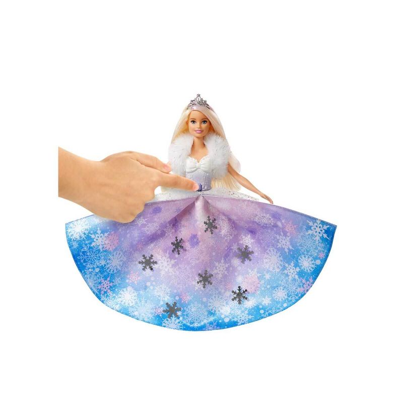 Elbise açılarak, gümüş kar taneleri ile lila, mavi ve pembe renkli gölgeler ortaya çıkarır. Uzun, sarı saçlarındaki donuk pembe gölgeler, Barbie'ye büyülü bir hava katar. Minik prenseslerin Barbie'yi kraliyet maceralarına hazırlaması için set, saç tarağı da içerir.
