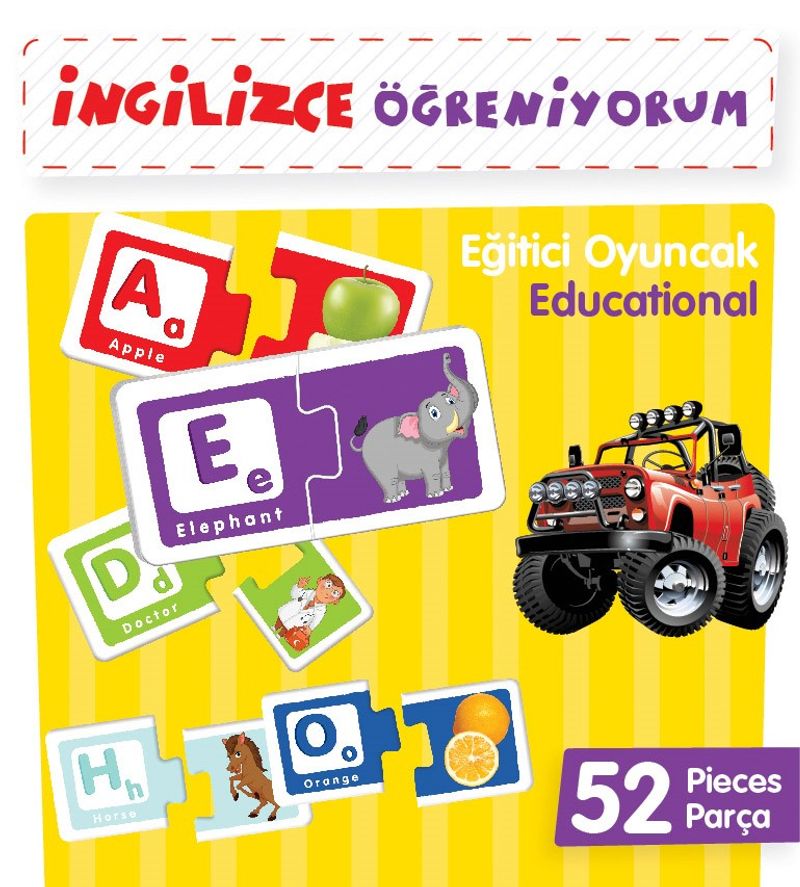İngilizce Öğreniyorum oyununda 26 adet harf kartı ve bu harflere karşılık gelecek kelimelerin baş harflerinden oluşan 26 adet resimli kart, toplamda kutumuzda 52 adet oyun kartı vardır. İlk önce bütün kartların eşlerini bularak birleştirelim. Daha sonra İngilizce kelimeler çocuğunuza tekrar ettirilip akılda kalması sağlanır. Bütün oyun kartları karıştırılır ve çocuğunuzdan her İngilizce kelime kartından resimdeki İngilizce kelimenin sesi ile başlayan kartı bulmasını ve bu kartları birleştirmesi istenir. İngilizce Öğreniyorum oyun kartlarıyla çocukların İngilizceyi kelimelerle ses karşılığı harflerin birbirleriyle arasındaki ilişkiyi anlayarak çok kolay İngilizce alfabeyi öğrenmelerinde faydalı olacaktır.