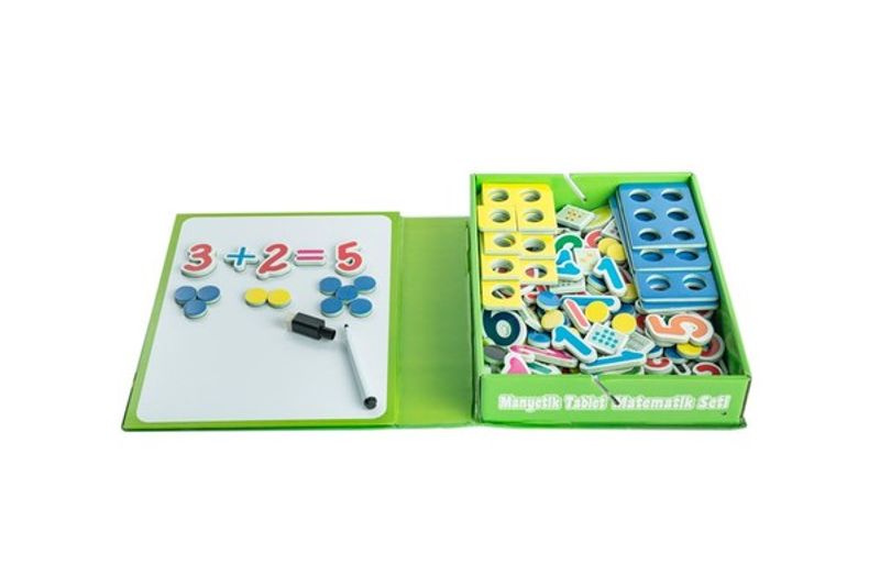 98 parçadan oluşan set içerisinde; 20 mayetik rakam, 60 manyetik yuvarlak oyun taşı, 11 büyük tamamlama kartları, 6 manyetik işlem sembolü, 1 adet silinebilen yazı kalemi ve eğitici oyunlar içeren aktivite kılavuzu yer almaktadır.