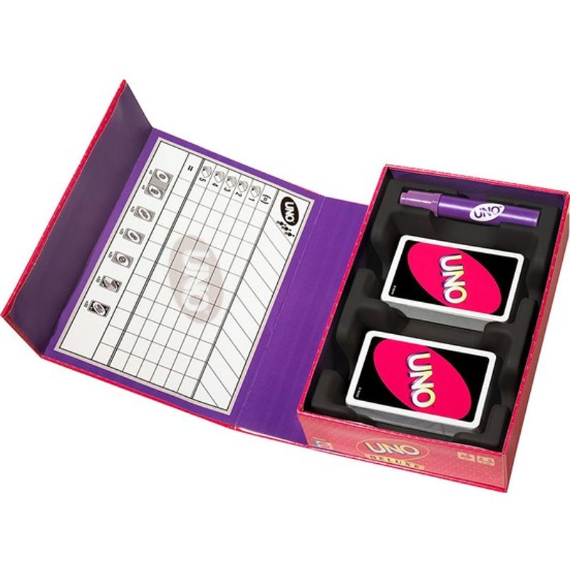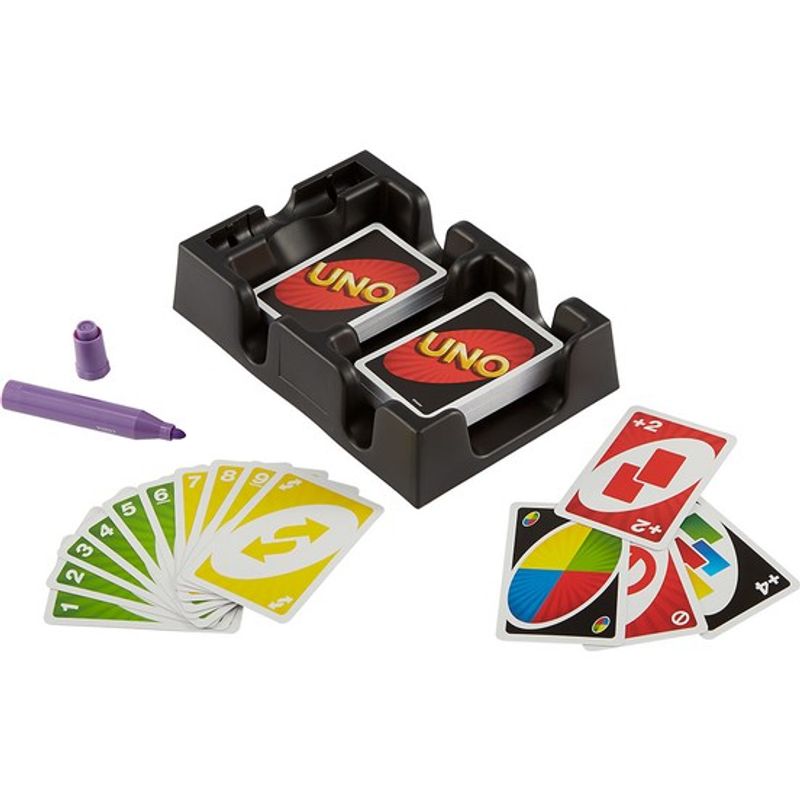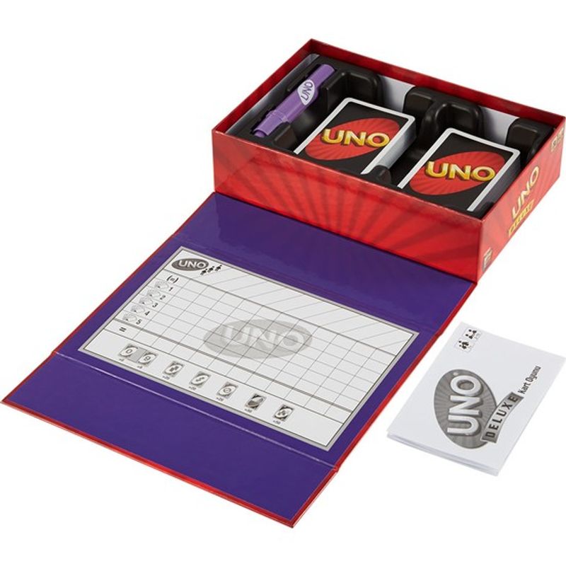 UNO® destesi, çift destek kart tepsisi, puan cetveli ve talimatlar kılavuzu dahildir.
