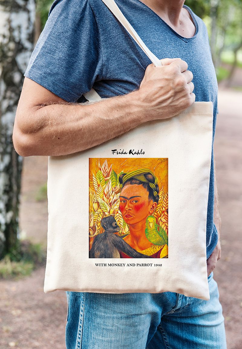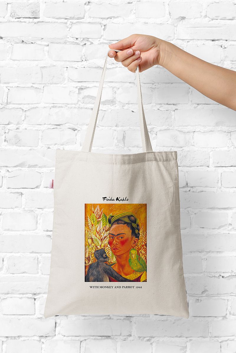 Askılı Bez Çanta - Ressamlar - Frida Kahlo - With Monkey And Parrot 1942