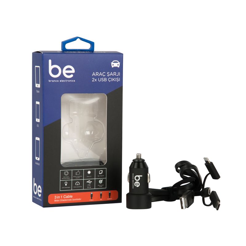 Branco SN-309 Araç Şarjı ve 3 in 1 Şarj Kablosu ( SİYAH) (Lightning, Micro USB, Type-C) (SN-319)