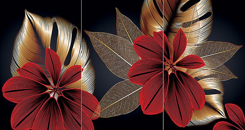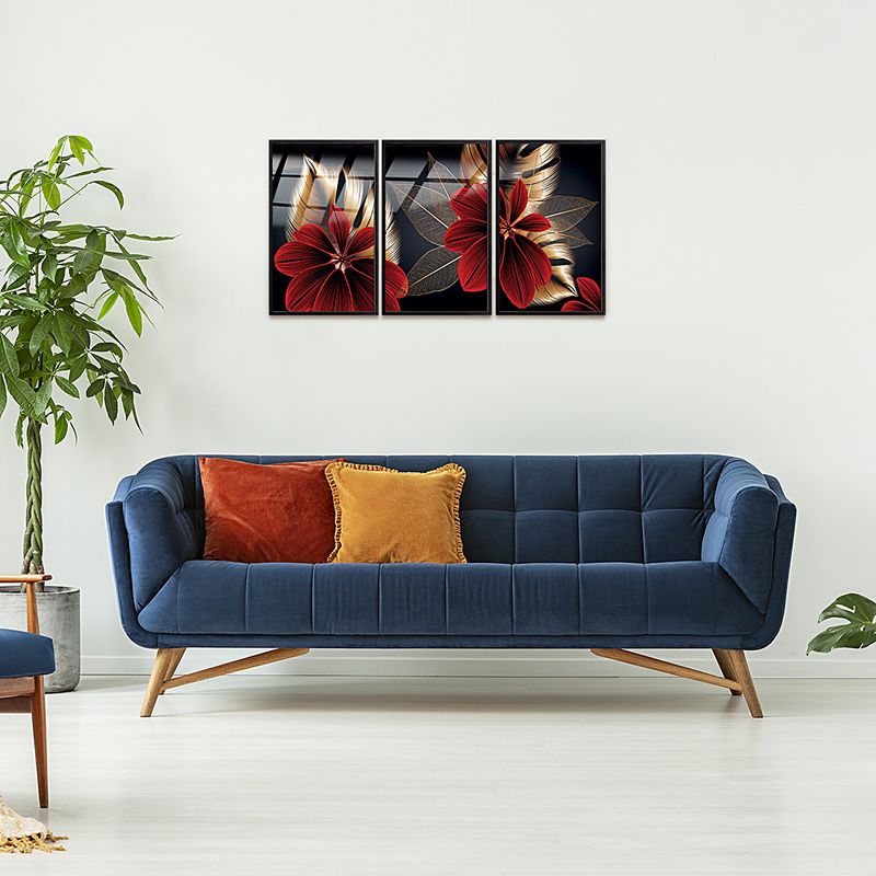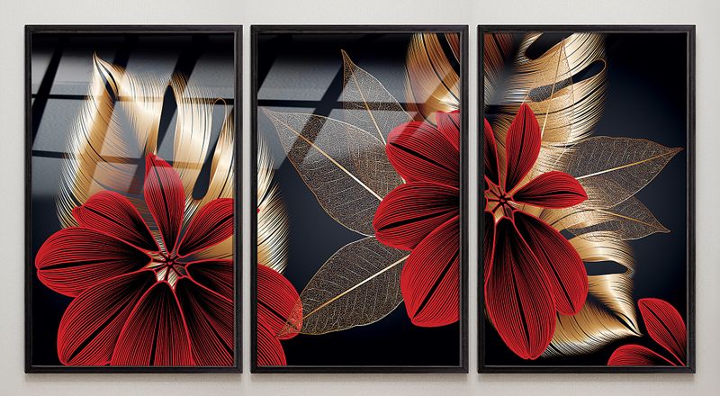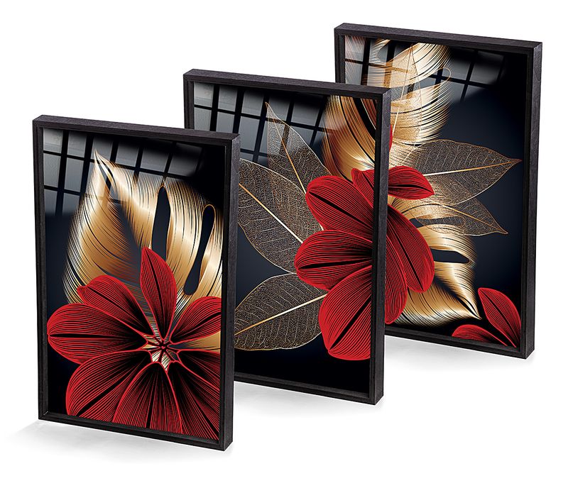 Full Frame Duvar Sanatları - VitrayObje Küçük DD - Monstera Kırmızılı Altın - Üçlü Set (FF-DSC073)