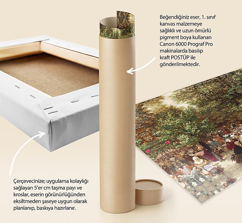 * Beğendiğiniz eser; 1. sınıf kanvas malzemeye sağlıklı ve uzun ömürlü pigment boya kullanılarak, Canon 6000 (12 Renk) Prograf Pro makinalarda basılıp kraft POSTÜP ile gönderilmektedir.