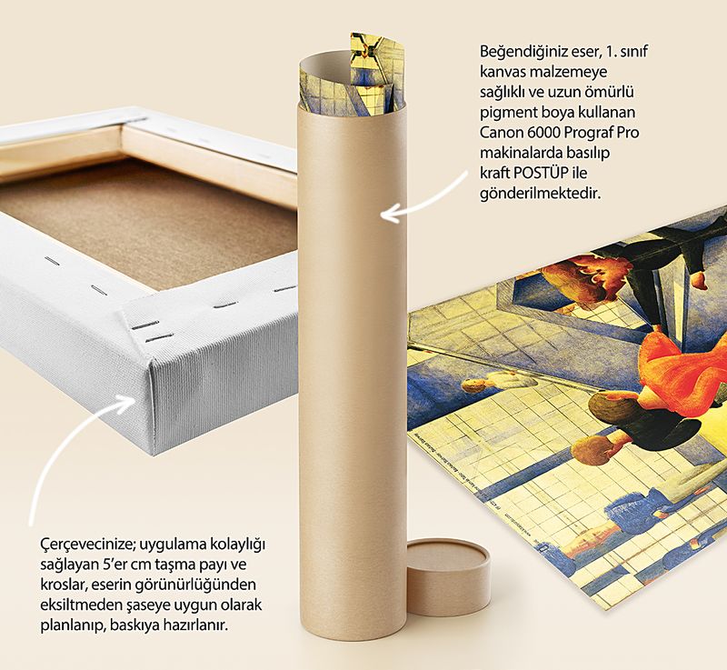 * Beğendiğiniz eser; 1. sınıf kanvas malzemeye sağlıklı ve uzun ömürlü pigment boya kullanılarak, Canon 6000 (12 Renk) Prograf Pro makinalarda basılıp kraft POSTÜP ile gönderilmektedir.