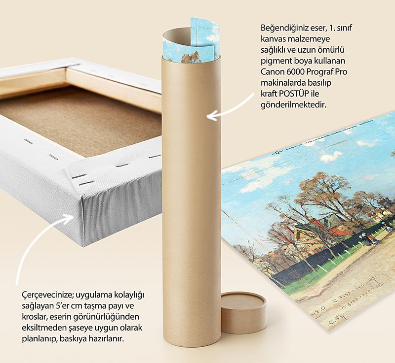 * Beğendiğiniz eser; 1. sınıf kanvas malzemeye sağlıklı ve uzun ömürlü pigment boya kullanılarak, Canon 6000 (12 Renk) Prograf Pro makinalarda basılıp kraft POSTÜP ile gönderilmektedir.