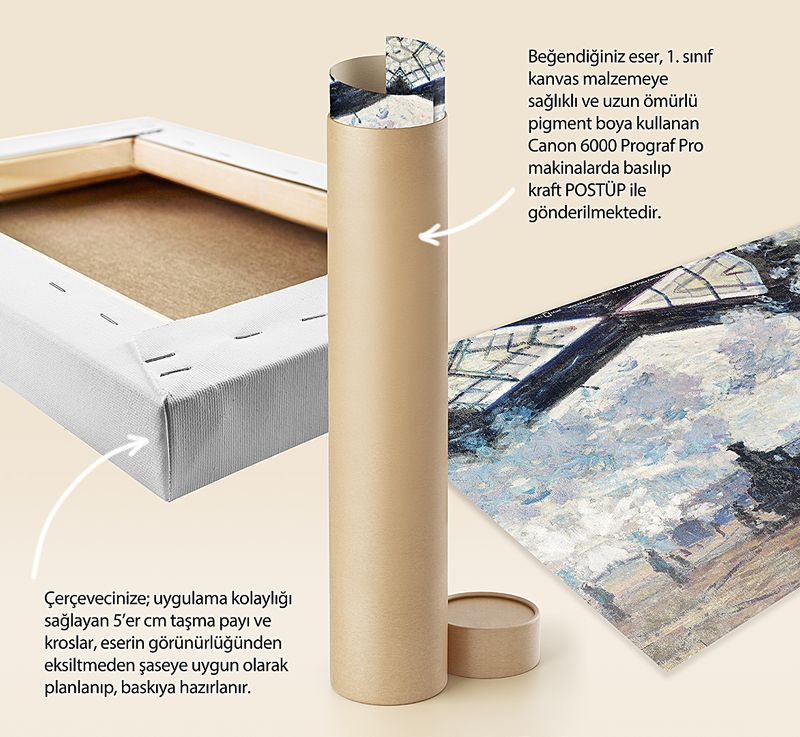 * Beğendiğiniz eser; 1. sınıf kanvas malzemeye sağlıklı ve uzun ömürlü pigment boya kullanılarak, Canon 6000 (12 Renk) Prograf Pro makinalarda basılıp kraft POSTÜP ile gönderilmektedir.