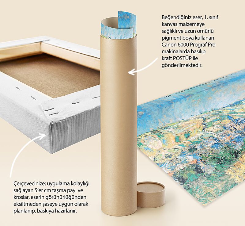 Tüm baskılarda %100 pamuk 1. sınıf sanatsal kanvas (tuval) bezi kullanılır. Kanvasın kendine has dokusunu tablonuzda görebilirsiniz.