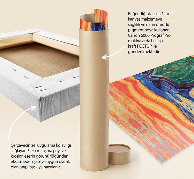 * Beğendiğiniz eser; 1. sınıf kanvas malzemeye sağlıklı ve uzun ömürlü pigment boya kullanılarak, Canon 6000 (12 Renk) Prograf Pro makinalarda basılıp kraft POSTÜP ile gönderilmektedir.
