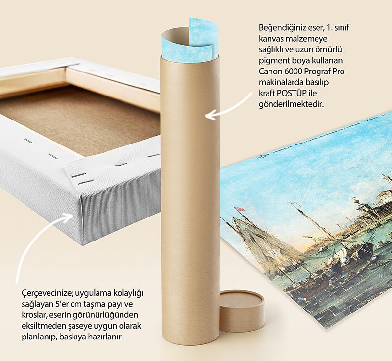 * Beğendiğiniz eser; 1. sınıf kanvas malzemeye sağlıklı ve uzun ömürlü pigment boya kullanılarak, Canon 6000 (12 Renk) Prograf Pro makinalarda basılıp kraft POSTÜP ile gönderilmektedir.