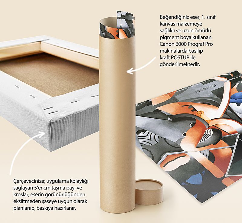 * Beğendiğiniz eser; 1. sınıf kanvas malzemeye sağlıklı ve uzun ömürlü pigment boya kullanılarak, Canon 6000 (12 Renk) Prograf Pro makinalarda basılıp kraft POSTÜP ile gönderilmektedir.