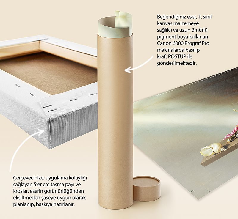 Tüm baskılarda %100 pamuk 1. sınıf sanatsal kanvas (tuval) bezi kullanılır. Kanvasın kendine has dokusunu tablonuzda görebilirsiniz.