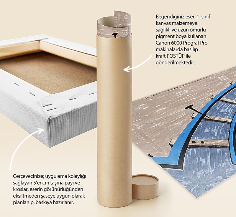 * Beğendiğiniz eser; 1. sınıf kanvas malzemeye sağlıklı ve uzun ömürlü pigment boya kullanılarak, Canon 6000 (12 Renk) Prograf Pro makinalarda basılıp kraft POSTÜP ile gönderilmektedir.