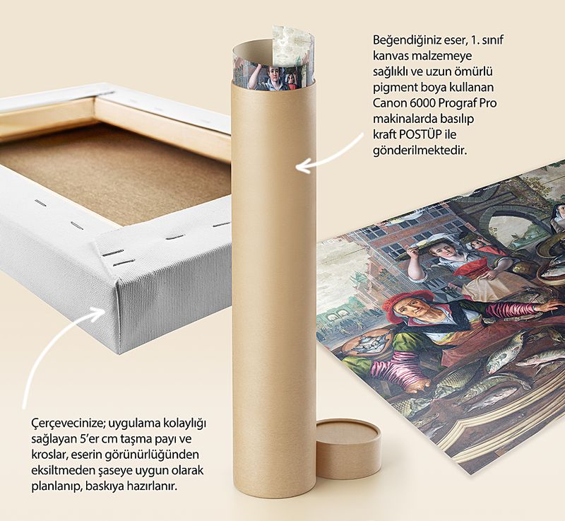 * Beğendiğiniz eser; 1. sınıf kanvas malzemeye sağlıklı ve uzun ömürlü pigment boya kullanılarak, Canon 6000 (12 Renk) Prograf Pro makinalarda basılıp kraft POSTÜP ile gönderilmektedir.