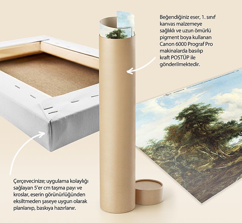Tüm baskılarda %100 pamuk 1. sınıf sanatsal kanvas (tuval) bezi kullanılır. Kanvasın kendine has dokusunu tablonuzda görebilirsiniz.