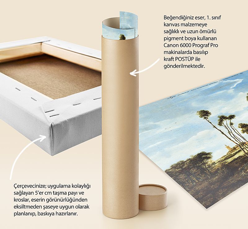 Tüm baskılarda %100 pamuk 1. sınıf sanatsal kanvas (tuval) bezi kullanılır. Kanvasın kendine has dokusunu tablonuzda görebilirsiniz.