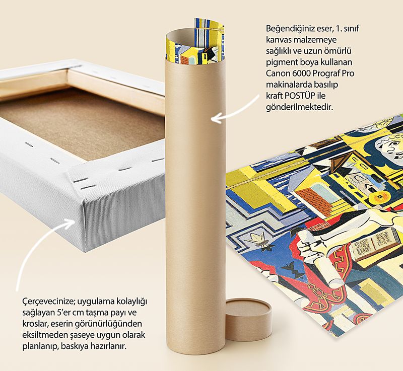 * Beğendiğiniz eser; 1. sınıf kanvas malzemeye sağlıklı ve uzun ömürlü pigment boya kullanılarak, Canon 6000 (12 Renk) Prograf Pro makinalarda basılıp kraft POSTÜP ile gönderilmektedir.