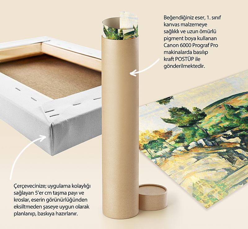 * Beğendiğiniz eser; 1. sınıf kanvas malzemeye sağlıklı ve uzun ömürlü pigment boya kullanılarak, Canon 6000 (12 Renk) Prograf Pro makinalarda basılıp kraft POSTÜP ile gönderilmektedir.