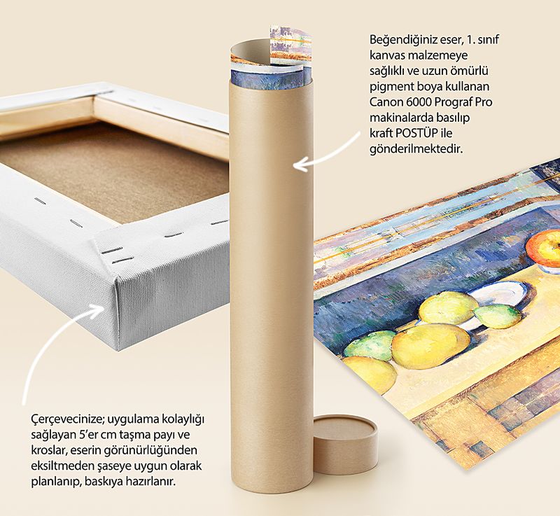 Tüm baskılarda %100 pamuk 1. sınıf sanatsal kanvas (tuval) bezi kullanılır. Kanvasın kendine has dokusunu tablonuzda görebilirsiniz.