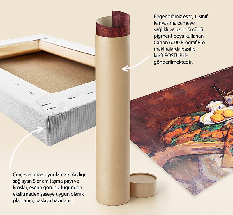 Tüm baskılarda %100 pamuk 1. sınıf sanatsal kanvas (tuval) bezi kullanılır. Kanvasın kendine has dokusunu tablonuzda görebilirsiniz.