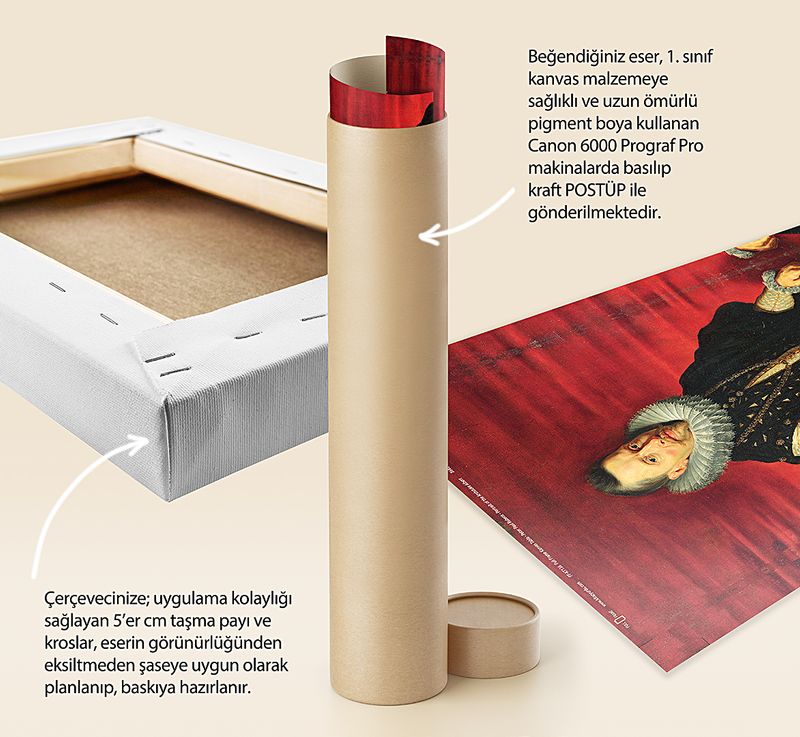 Tüm baskılarda %100 pamuk 1. sınıf sanatsal kanvas (tuval) bezi kullanılır. Kanvasın kendine has dokusunu tablonuzda görebilirsiniz.