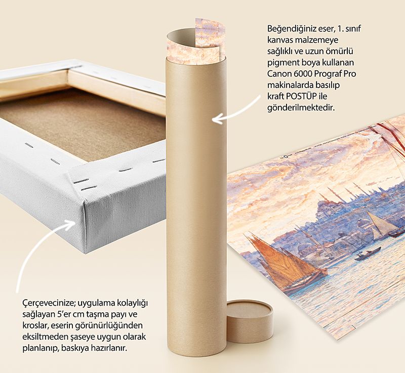 * Beğendiğiniz eser; 1. sınıf kanvas malzemeye sağlıklı ve uzun ömürlü pigment boya kullanılarak, Canon 6000 (12 Renk) Prograf Pro makinalarda basılıp kraft POSTÜP ile gönderilmektedir.