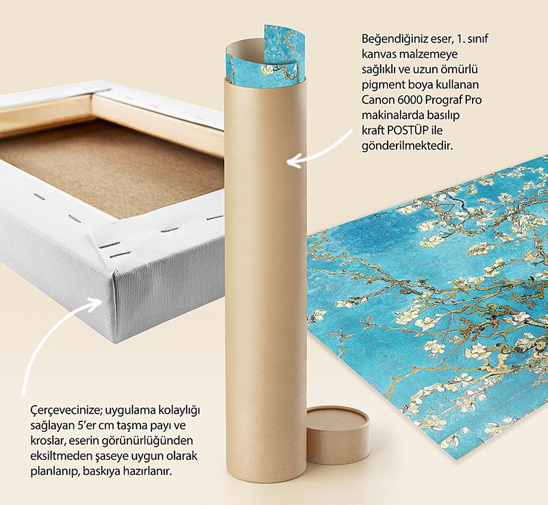 Tüm baskılarda %100 pamuk 1. sınıf sanatsal kanvas (tuval) bezi kullanılır. Kanvasın kendine has dokusunu tablonuzda görebilirsiniz.