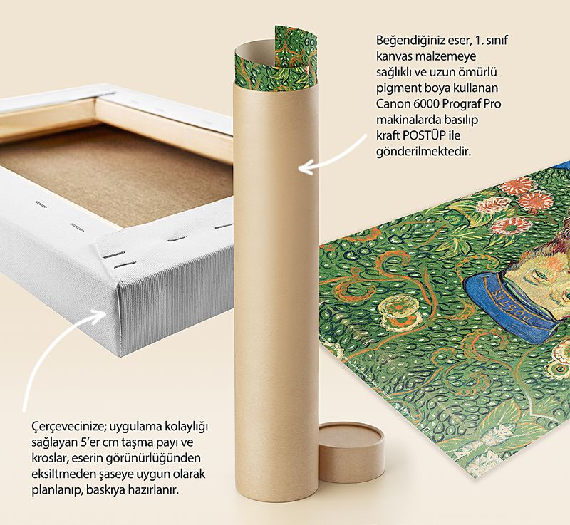 Tüm baskılarda %100 pamuk 1. sınıf sanatsal kanvas (tuval) bezi kullanılır. Kanvasın kendine has dokusunu tablonuzda görebilirsiniz.