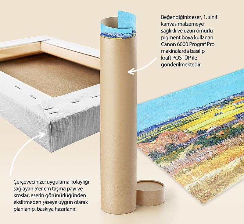 * Beğendiğiniz eser; 1. sınıf kanvas malzemeye sağlıklı ve uzun ömürlü pigment boya kullanılarak, Canon 6000 (12 Renk) Prograf Pro makinalarda basılıp kraft POSTÜP ile gönderilmektedir.