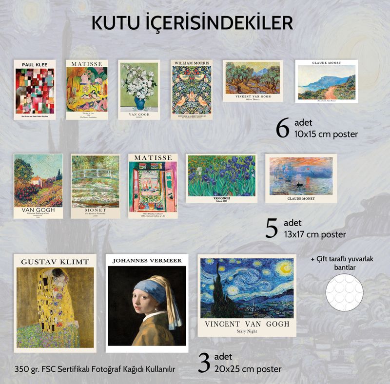 Ayrıca, kutunun içinde posterlerinizi kolayca asabilmeniz için yuvarlak çift taraflı bantlar da bulunmaktadır. Eklektik Poster Seti, farklı boyutları ve çevre dostu malzemeleri ile duvarlarınıza sanatsal bir dokunuş katmak için ideal bir seçimdir. Bu set ile sanatı yaşam alanlarınıza kolayca taşıyın ve her gün sanatı hissedin.