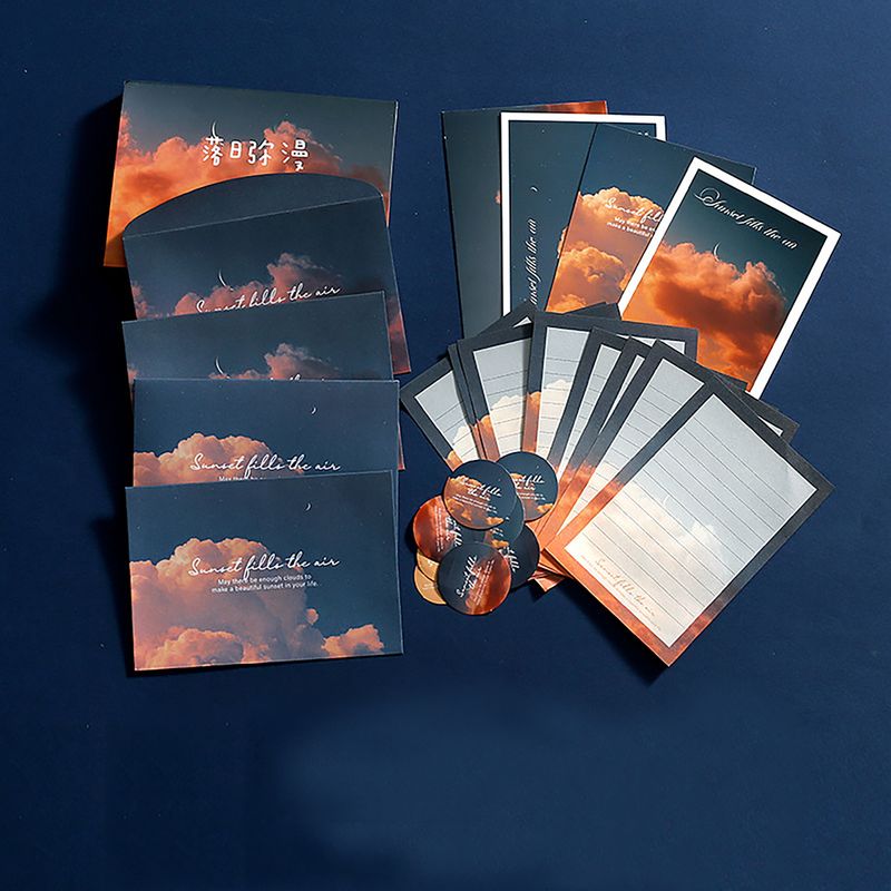 Gün Batımı Hatıraları Mektup Seti, 15 x 10 cm boyutlarında bir kutu içerisinde yer alır ve nostaljik bir mektup yazma deneyimi sunar. Bulutların ve gün batımının büyüleyici renklerini taşıyan zarflar, kartpostallar, mektup kağıtları ve çıkartmalar ile özel anlarınızı sevdiklerinizle paylaşmanız için mükemmel bir seçimdir.