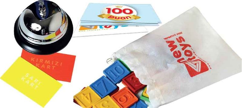 İÇERİK:  1 adet çelik zil, 20 adet 1x3x3 cm kare şeklinde parça, 40 adet puan kartı