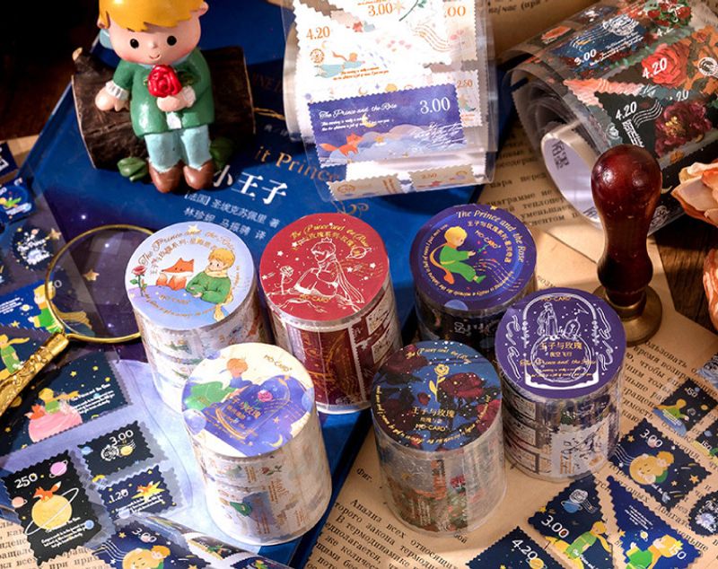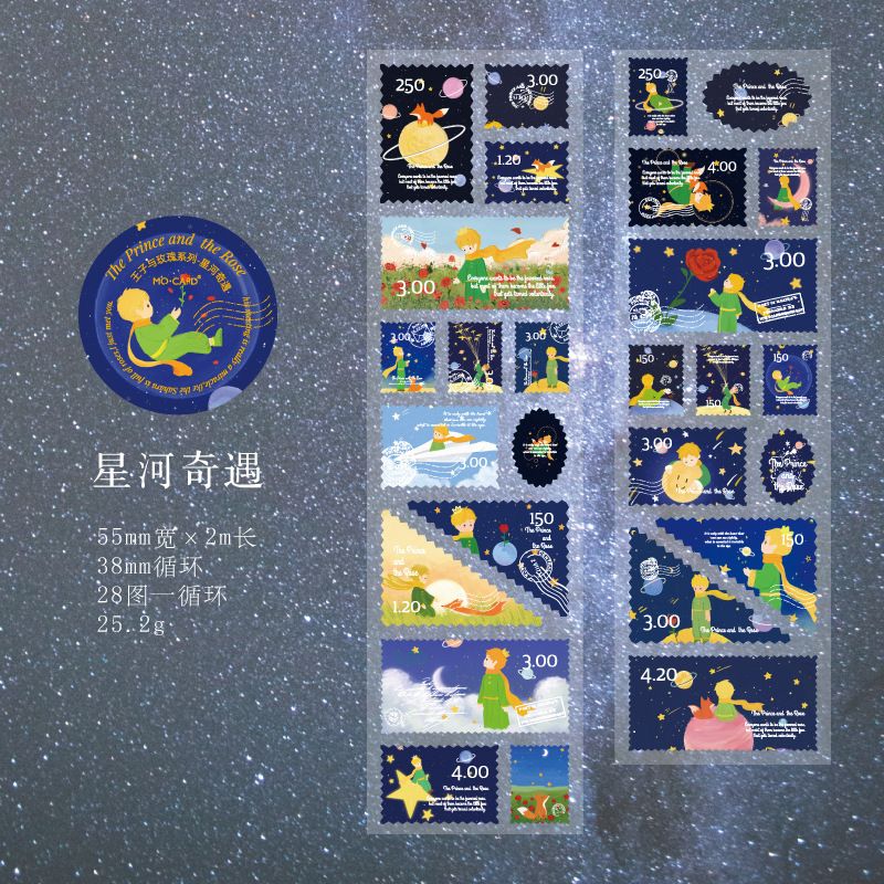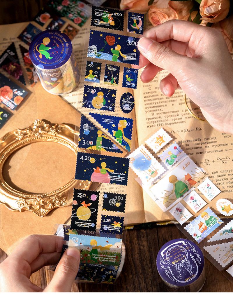 Bu özel rulo sticker seti, Küçük Prens ve yıldızlı geceler temasını bir araya getiren pul şeklinde 100'den fazla sticker içerir. 55 mm genişliğinde ve 2 m uzunluğunda olan bu kağıt stickerlar, defterlerinizi, kartlarınızı veya diğer kişisel eşyalarınızı süslemek için mükemmeldir.