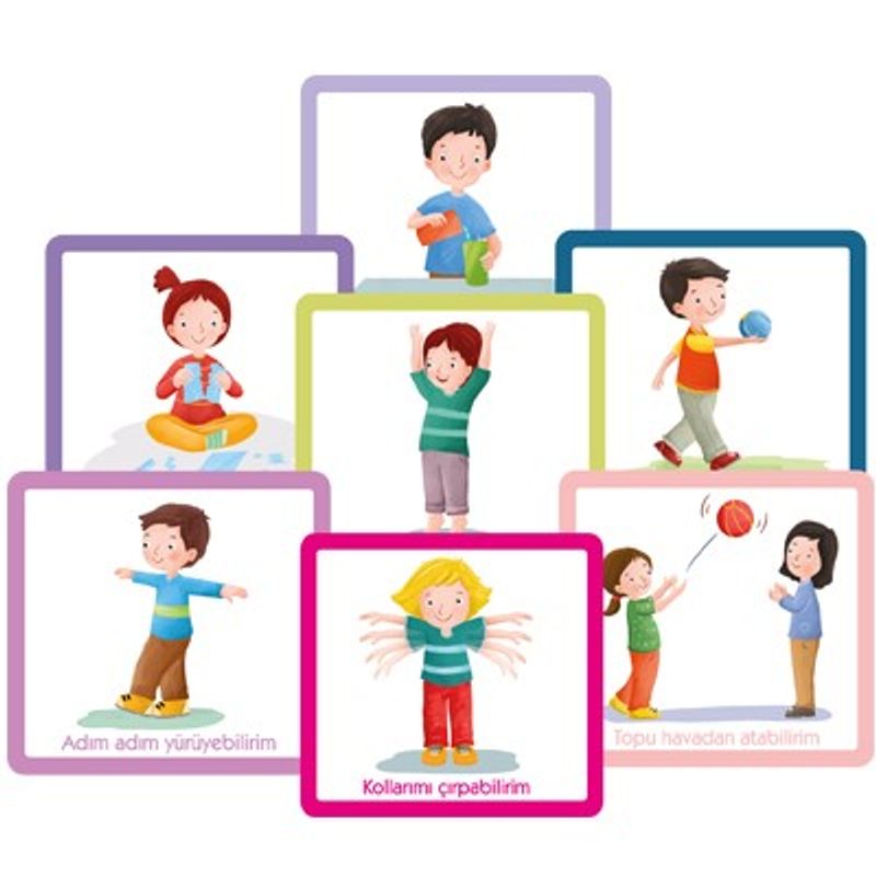 Tüm kartlar da çocuğunuzun 15 ila 24. ayın sonuna kadar kazanmış olması gereken motor becerileri ile gelişen motor beceriler sonucunda yapabilmesi gereken temel hareketler resimlenmiştir.