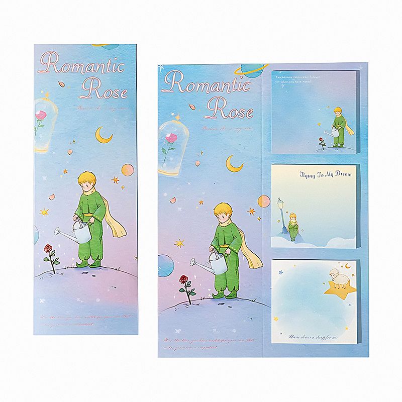 Küçük Prens'in eşsiz dünyasından ilham alan 60 adet zarif post-it notu ve hikayenin simgesel unsurlarıyla süslü bir ayraç içeriyor. Her bir post-it, hikayenin unutulmaz karakterlerini, güzel çizimlerini ve derin mesajlarını yansıtıyor.